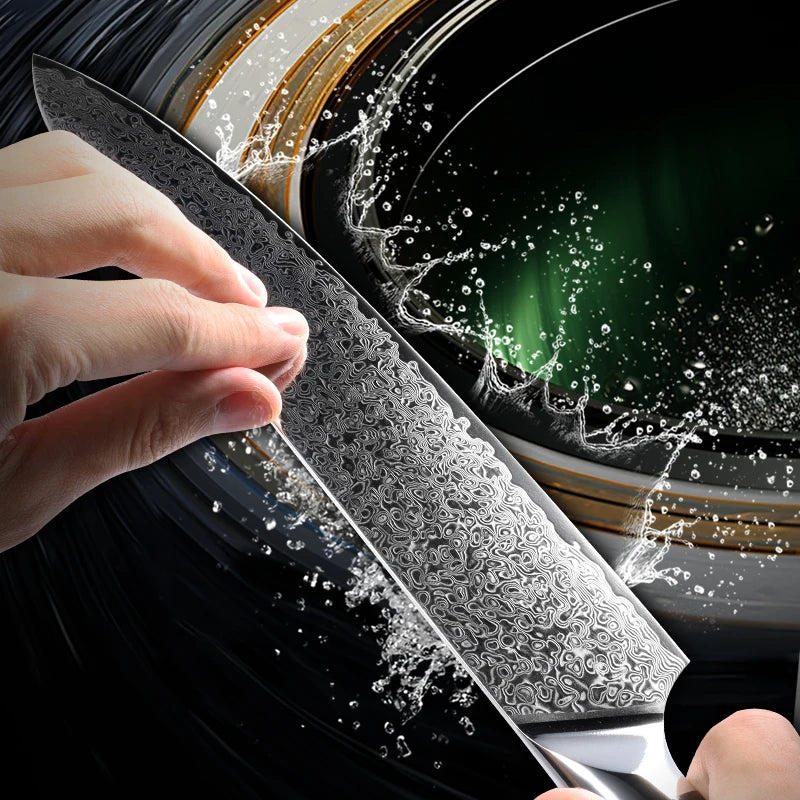 Product Specifications: Made with 67 Layers of Damascus Steel and a G10 Handle. this 9.5 inch Chef Knife boasts a 60 HRC Hardness and a Net Weight of 291g. Package includes a Knife Sheath and Gift Box.